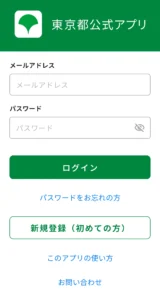 東京都公式アプリを開き、「新規登録(初めての方)」を押します。