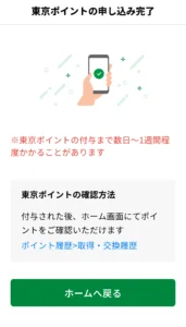 以上で東京ポイントの申し込みが完了しました。ポイントの付与には数日~1週間程度かかるということです。