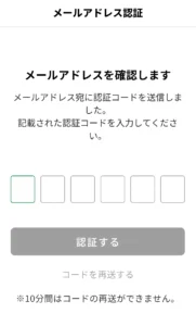 メールアドレス・パスワードを入力したら、登録したアドレスに届いた認証コードを入力します。