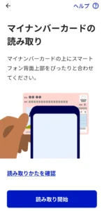 マイナンバーカードの上にスマートフォンをかざして読み取ります。